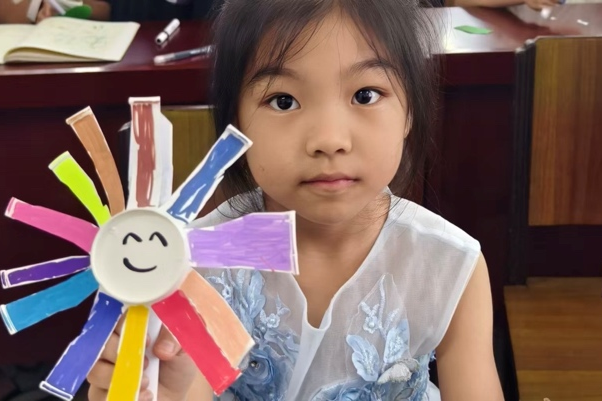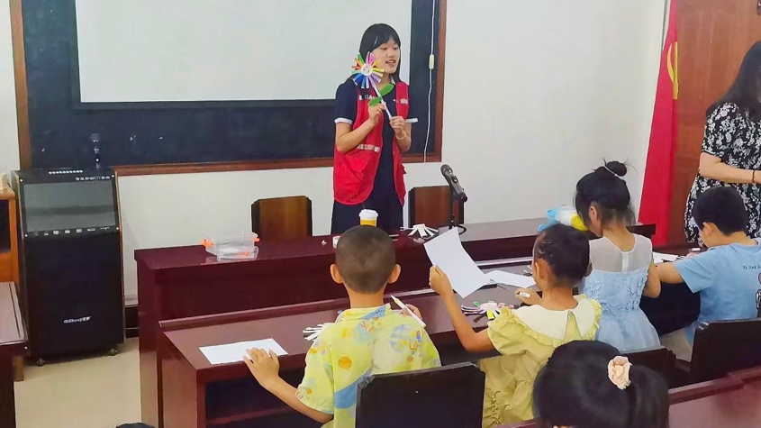 课堂上,她和其他志愿者一起,将手工创作的巧思拆解成易懂的步骤,教孩子们制作纸风车,孩子们专注的目光、雀跃的神情,成为夏日里最动人的画面;满是书籍的空间里,看着孩子们静静阅读、认真书写的模样,更让她感受到托管班不仅是玩乐的乐园,更是孩子们汲取知识、沉淀思绪的小天地。当孩子们举着亲手制作的风车肆意欢笑,当小小的成就感在孩童眼中绽放,她也在这份陪伴中,真切践行了 “奉献、友爱、互助、进步” 的志愿精神,懂得点滴行动也能为孩子们的假期添上温暖底色。