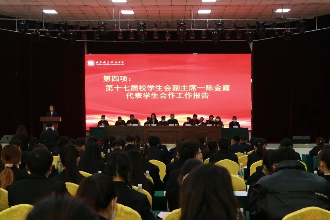陈金露同学代表第十七届学生会做了题为《不忘初心勇担当,砥砺奋进创辉煌——团结带领广大学生为加快推进学校高质量发展贡献青春力量》的工作报告。总结回顾了过去一年学生会在各方面取得的进步和存在的不足,并表示学生会要向创新型、凝聚型、学习型团队发展。