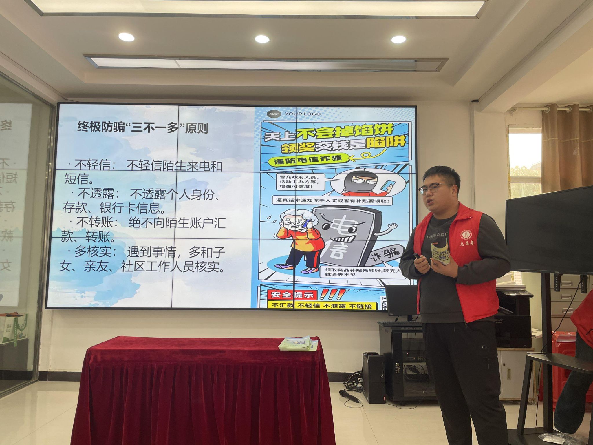 随后,防诈骗专项负责人温泉街道综治办干部葛隆文简要分享了部分典型诈骗案例,以真实案件警示现场居民诈骗风险无处不在,提醒大家提高警惕、筑牢思想防线。最后,咸宁职业技术学院商学院雅商志愿服务队的青年志愿者代表,结合精心准备的PPT,针对老年人常见诈骗手段,系统讲解了预防技巧与应对方法,并传授了通俗易懂的防骗口诀:不贪小便宜、不信“神医”谎言、生病首选正规医院、购物认准大平台、绝不私下转账、高收益警惕高风险、遇事多与子女商量。此外,志愿者还提醒现场居民,若不慎遭遇诈骗,切勿慌张自责,应第一时间保留聊天记录、转账凭证等证据,及时拨打110或全国反诈专线96110报警求助。
