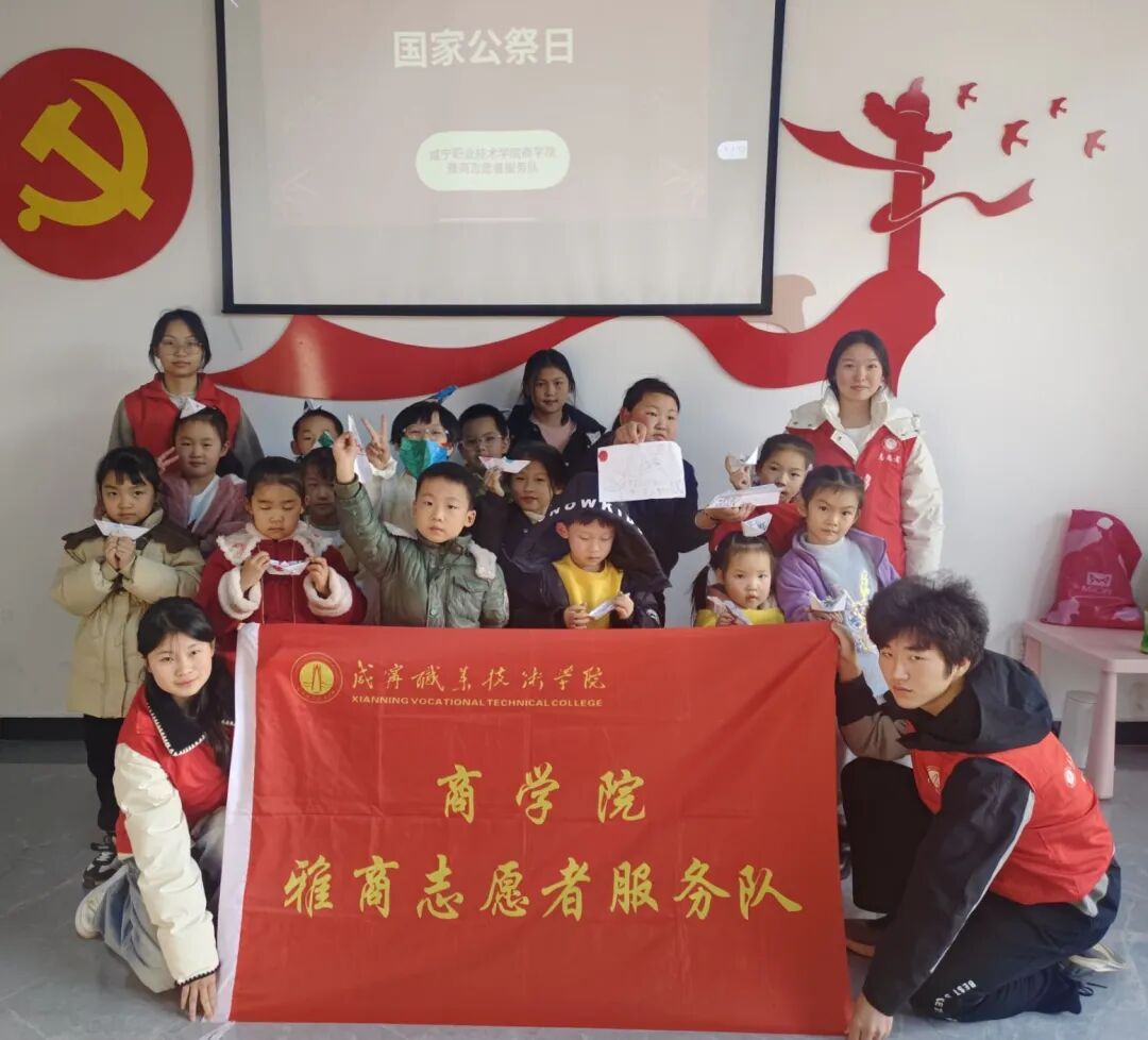 为引导小朋友们铭记历史、缅怀先烈,厚植珍爱和平的家国情怀,2025年12月13日下午三点咸宁职业技术学院商学院雅商志愿者服务队走进南昌路社区星悦公馆开展“国家公祭日”志愿活动。